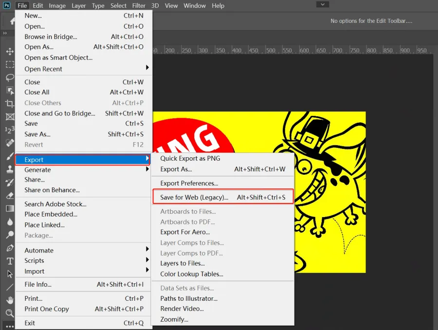 - Select File -> Save for Web in the format used for the Web and device.