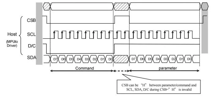 - D/C (DC): Data/Command control signal. A low level indicates a command is being written; a high level indicates data/parameters are being written.