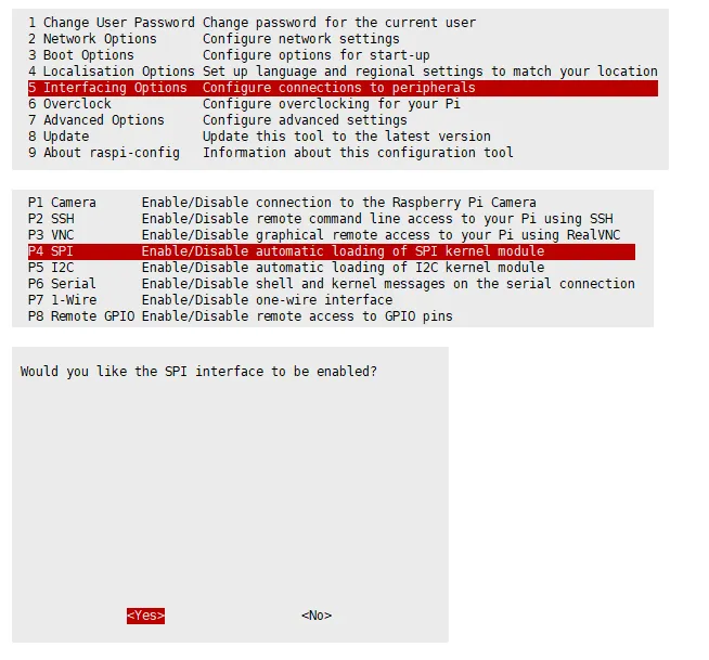 sudo raspi-configSelect Interfacing Options -> SPI -> Yes to enable the SPI interface