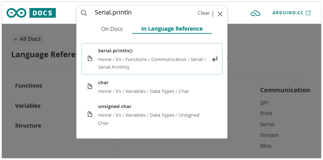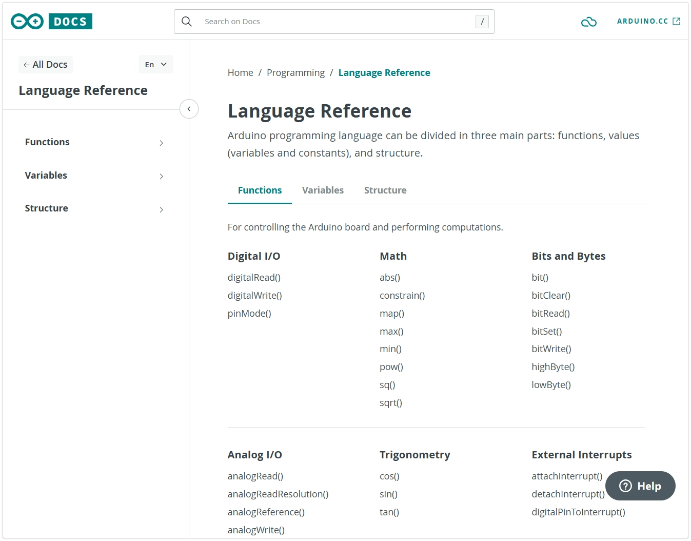 Serial.println) or browse through categories on the left (Variables, Functions, Libraries, etc.). Each entry typically contains a function description, syntax, parameter explanation, return values, and example code.