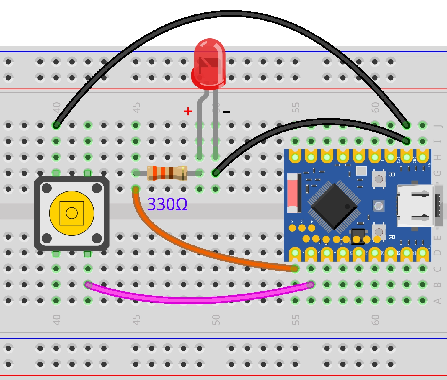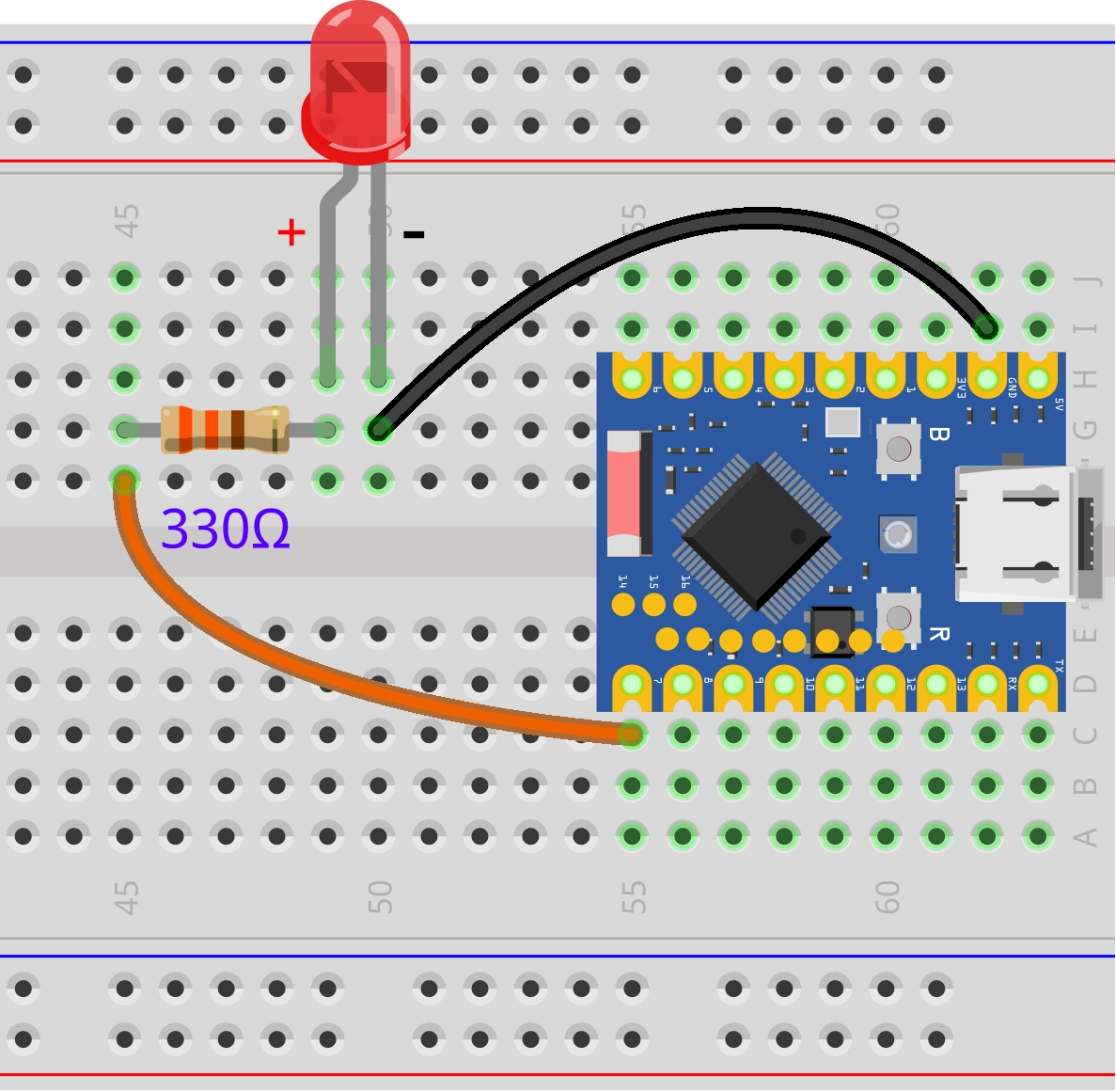 - Long leg (Anode): Connects to the other end of the resistor