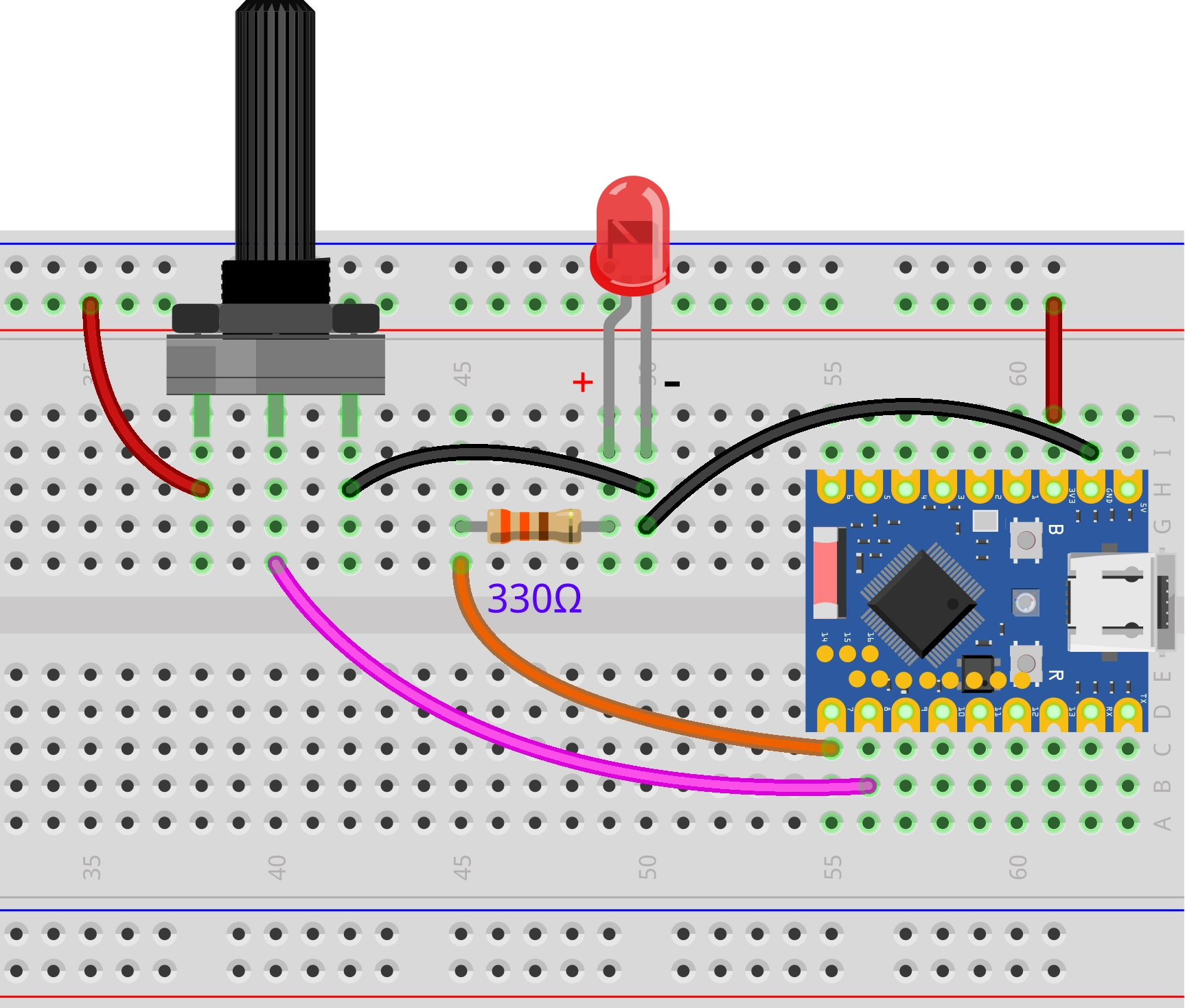 Try to implement: control the brightness of the LED light by adjusting the potentiometer knob, so that the knob position corresponds to the light brightness