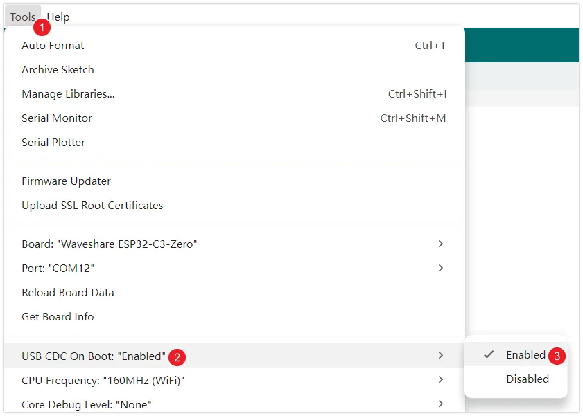 Check configuration options: In the Arduino IDE "Tools" menu, check and confirm that the "USB CDC On Boot" option is set to "Enabled".