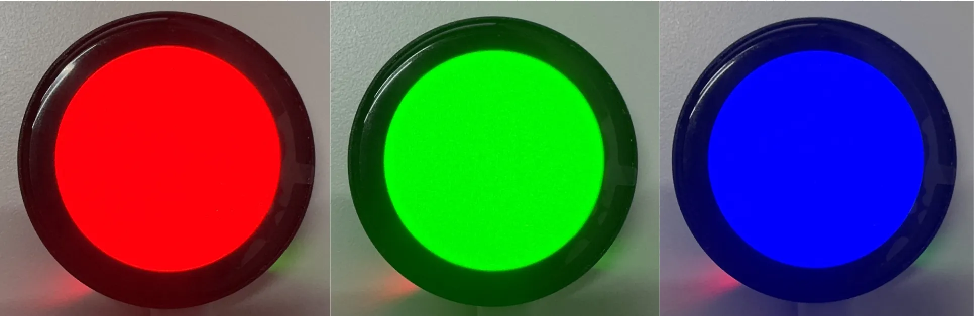 The display cycles through red, green, and blue colors (transition interval 1.5 seconds), as shown: