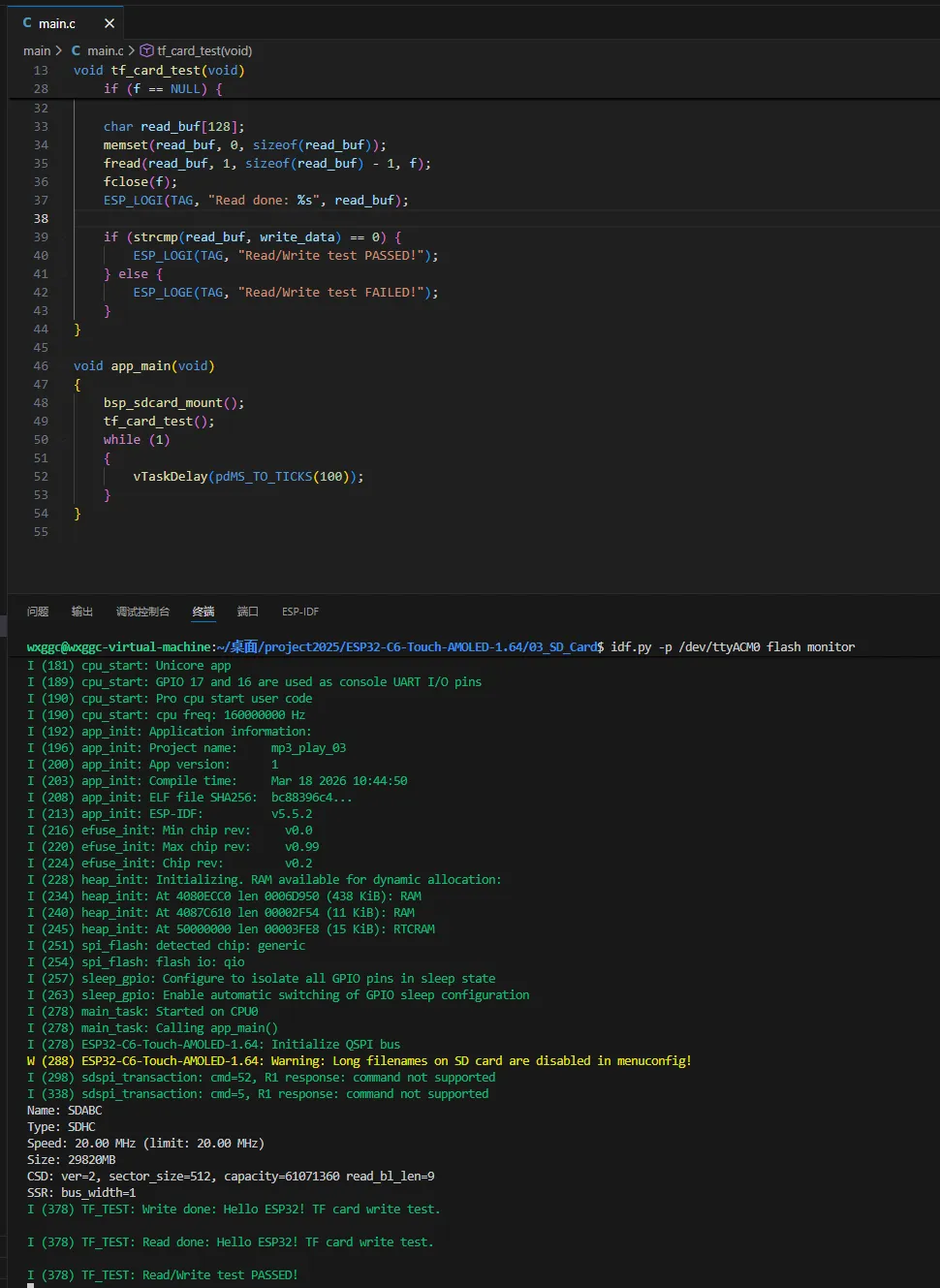 bsp_sdcard_mount(): Initialize the TF card via the SPI interfacetf_card_test(): Read/write file test