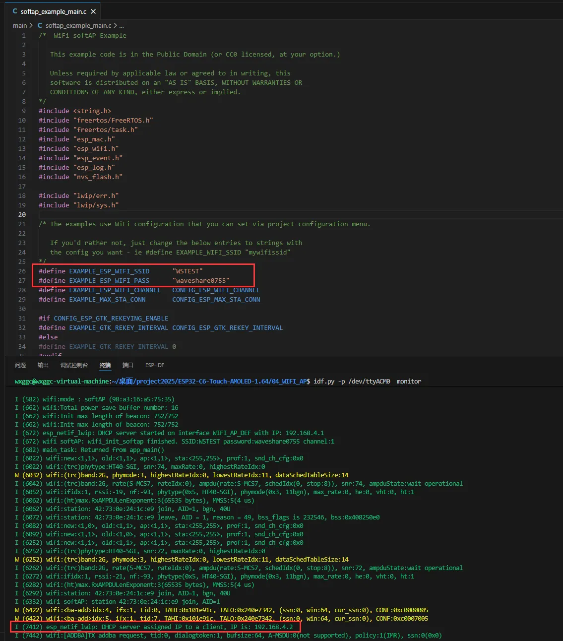 SSIDandPASSWORDin thesoftap_example_main.cfile. Then mobile phones or other devices in STA mode can use thisSSIDandPASSWORDto connect to the development board.