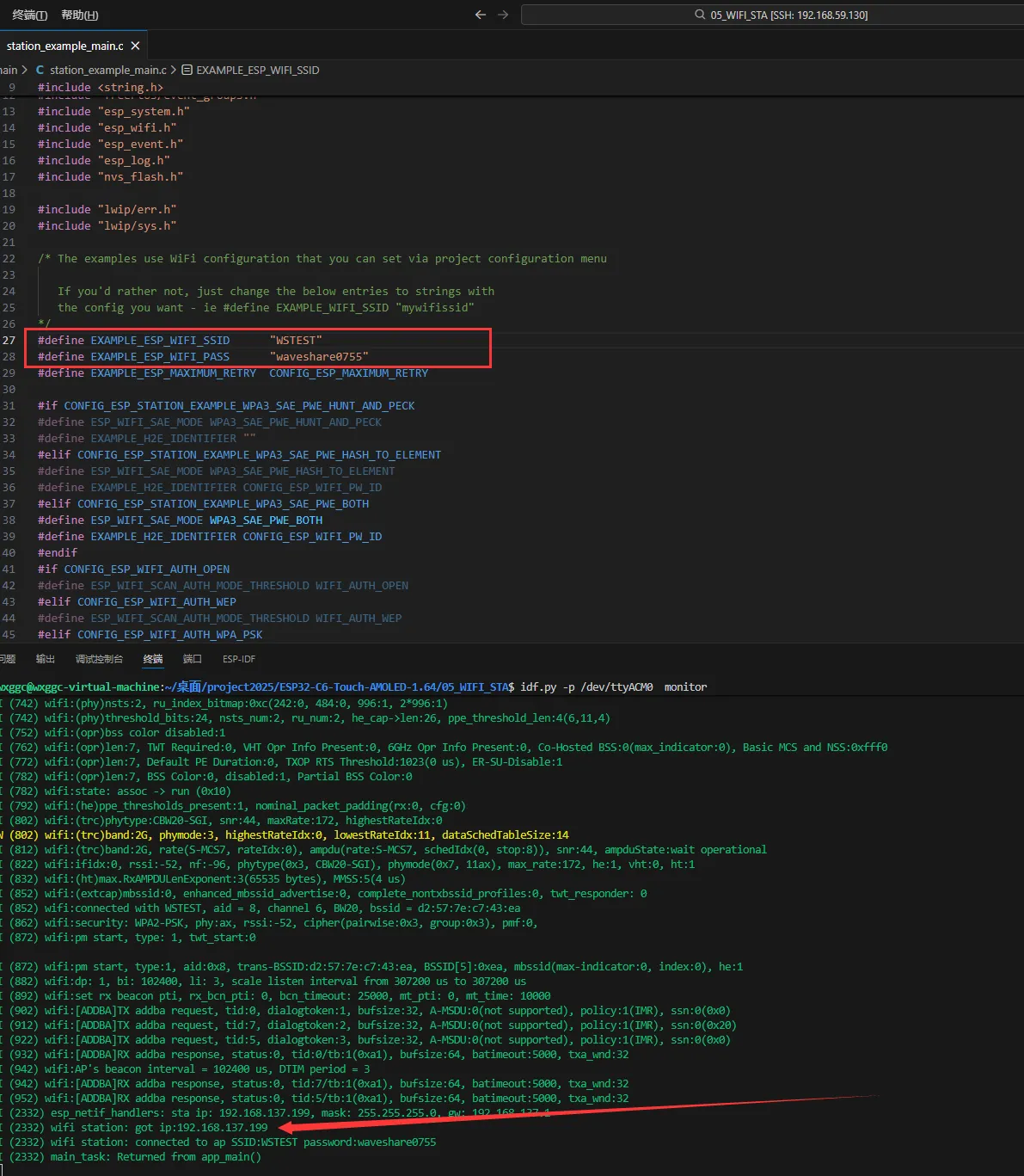 SSIDandPASSWORDin thestation_example_main.cfile, and modify them to theSSIDandPasswordof an available router in the current environment.
