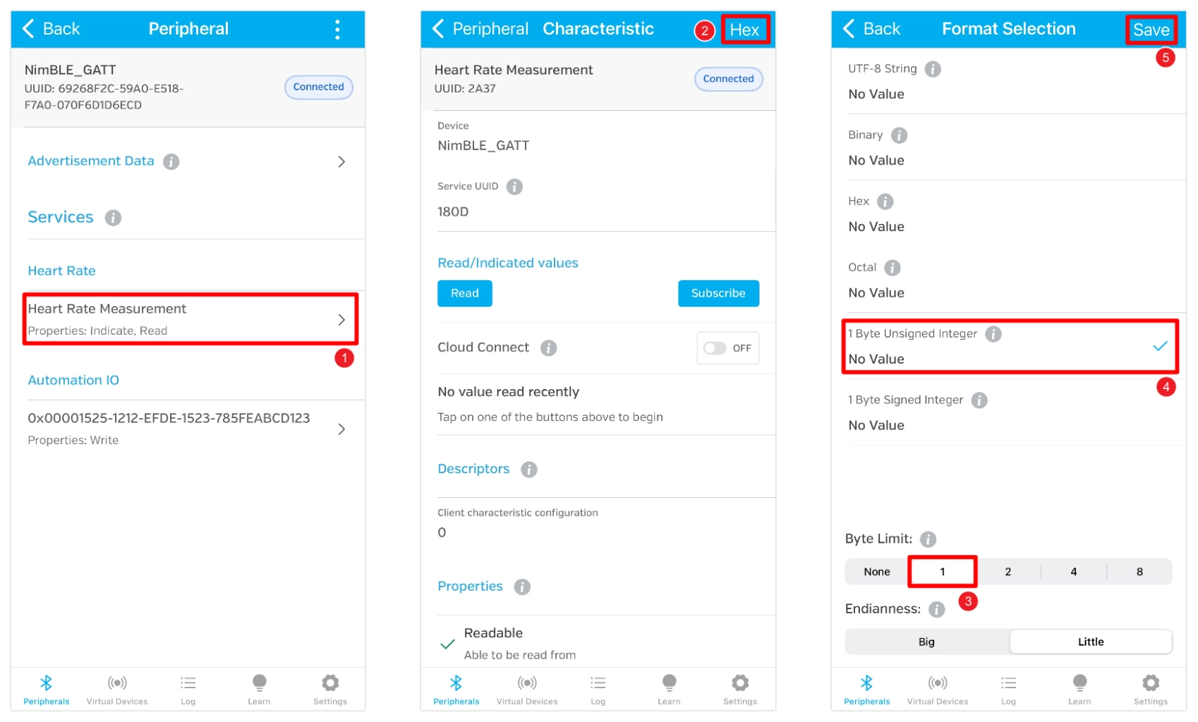 Click to enter the "Heart Rate Measurement" characteristic. Then click "HEX" in the top right corner to set the data type. Set "Byte Limit" to 1, select "1 Byte Unsigned Integer", and save for easier data viewing later.