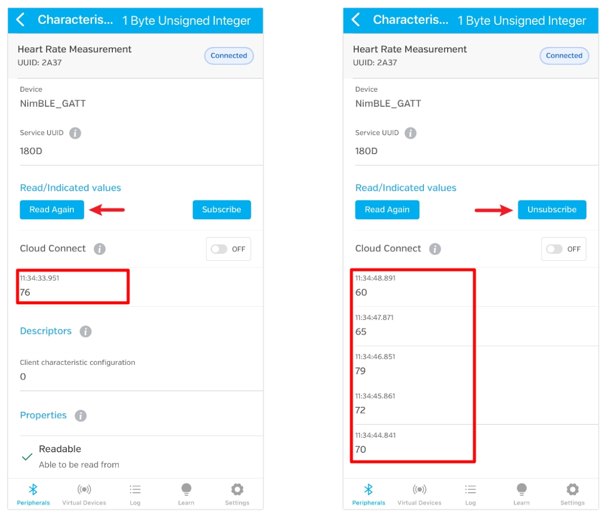 After saving, return to the characteristic details page and click "Read" to read the data. You can also click "Subscribe" to subscribe to data; updates will be pushed automatically when the heart rate value changes.