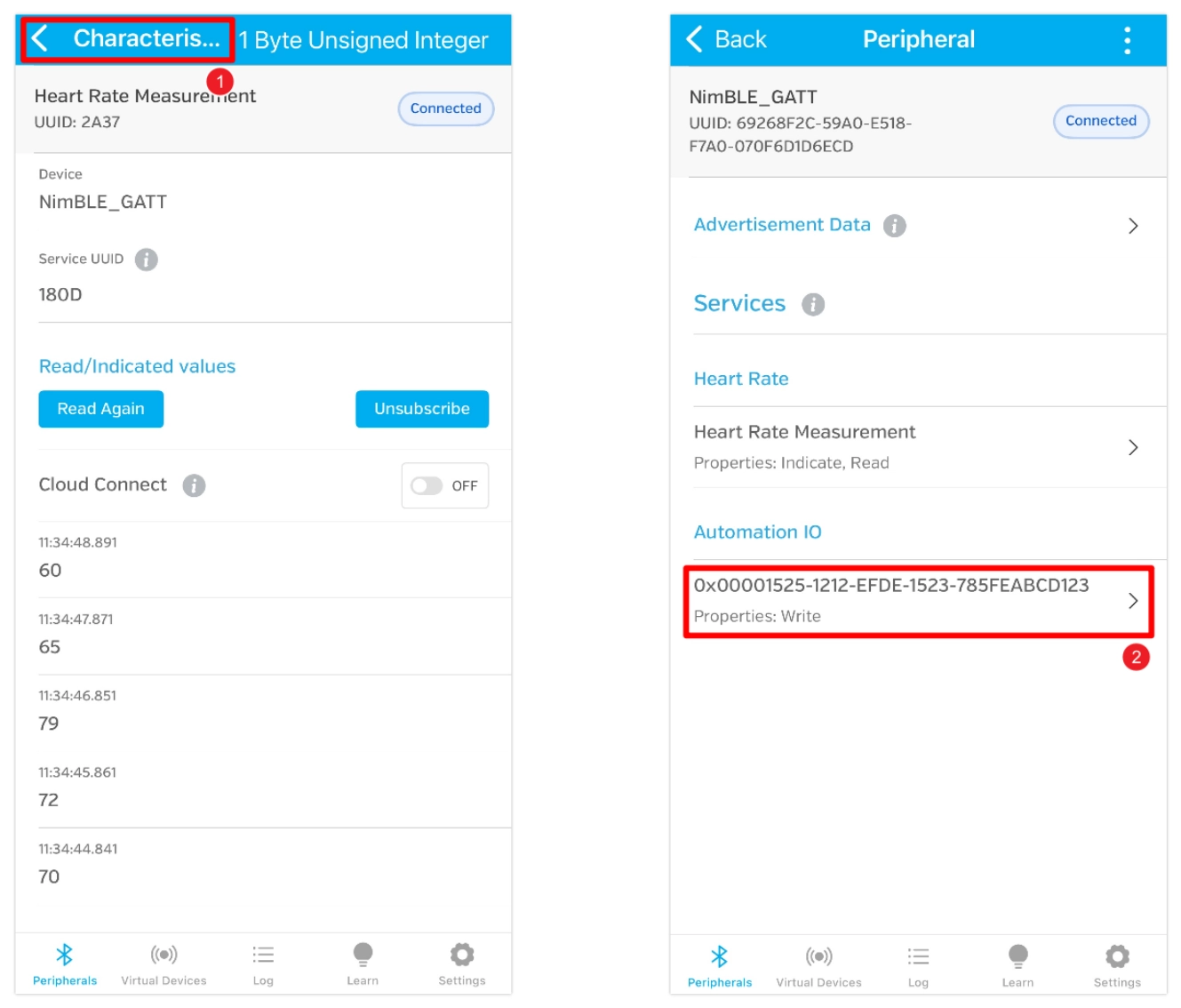 On the device details page, you can see the device has two services, each with one characteristic. Both services use standard Bluetooth SIG UUIDs, so they are automatically recognized as "Heart Rate" and "Automation IO", providing heart rate data reading and LED control functions respectively.