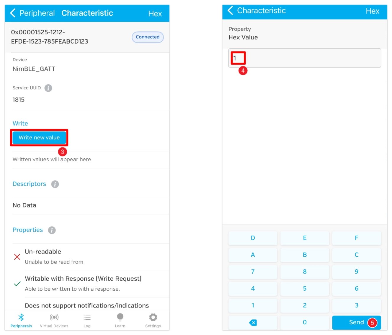 Click the back button in the top left corner to return to the previous page. Then enter the characteristic with UUID "0x00001525-1212-EFDE-1523-785FEABCD123".