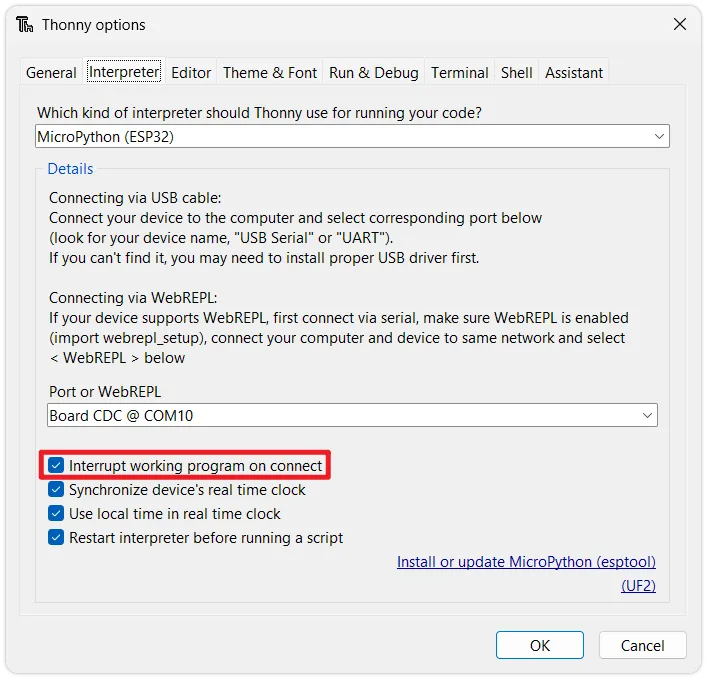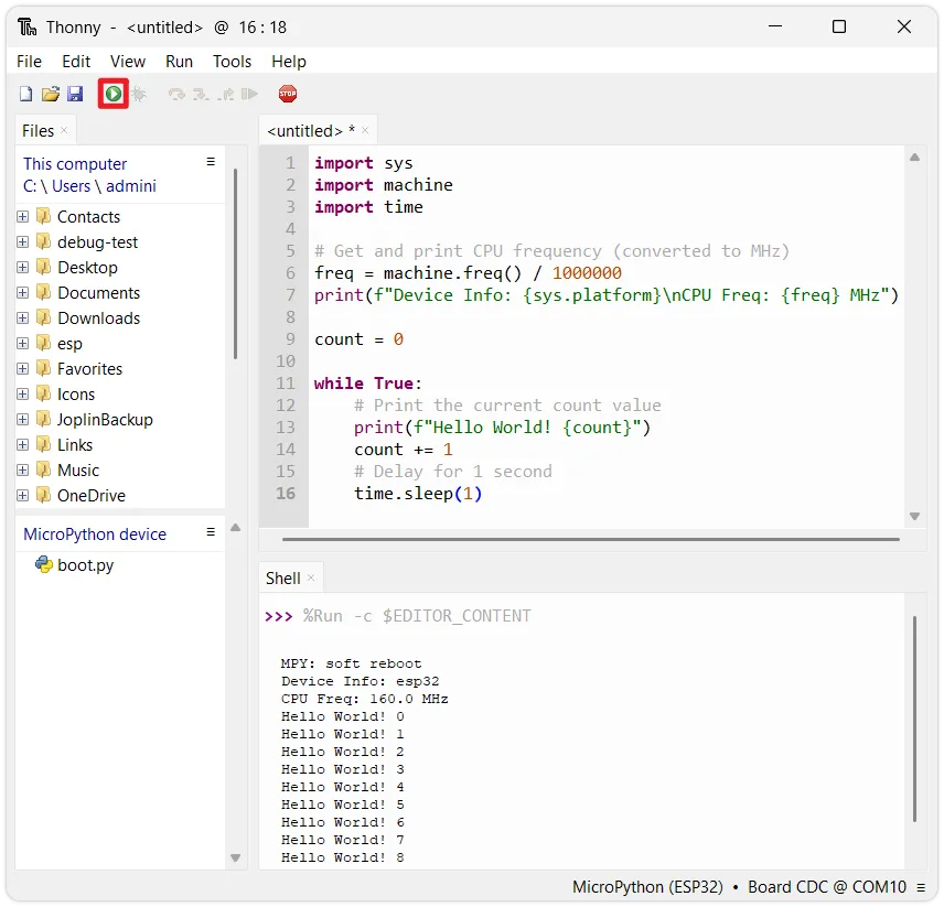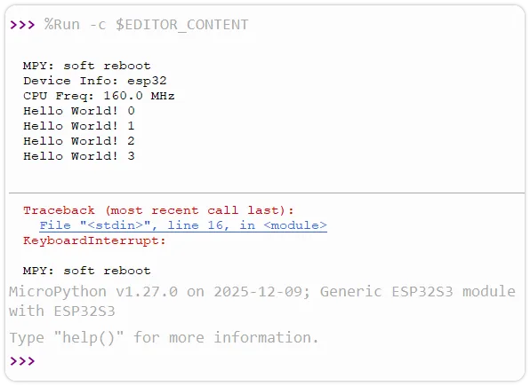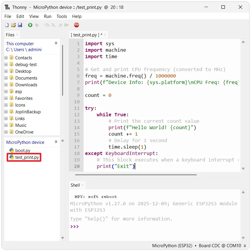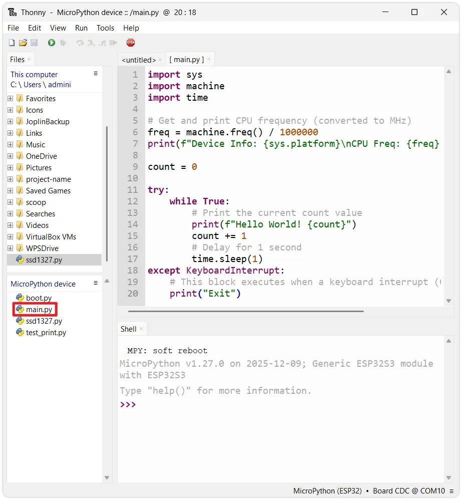 main.pyon power-up, the program stops immediately once connected by Thonny, resulting in no output in the Shell window.Pressing Ctrl + D (soft reset) in the REPL restarts the MicroPython interpreter while keeping the Thonny connection, allowing you to observe the full startup execution of