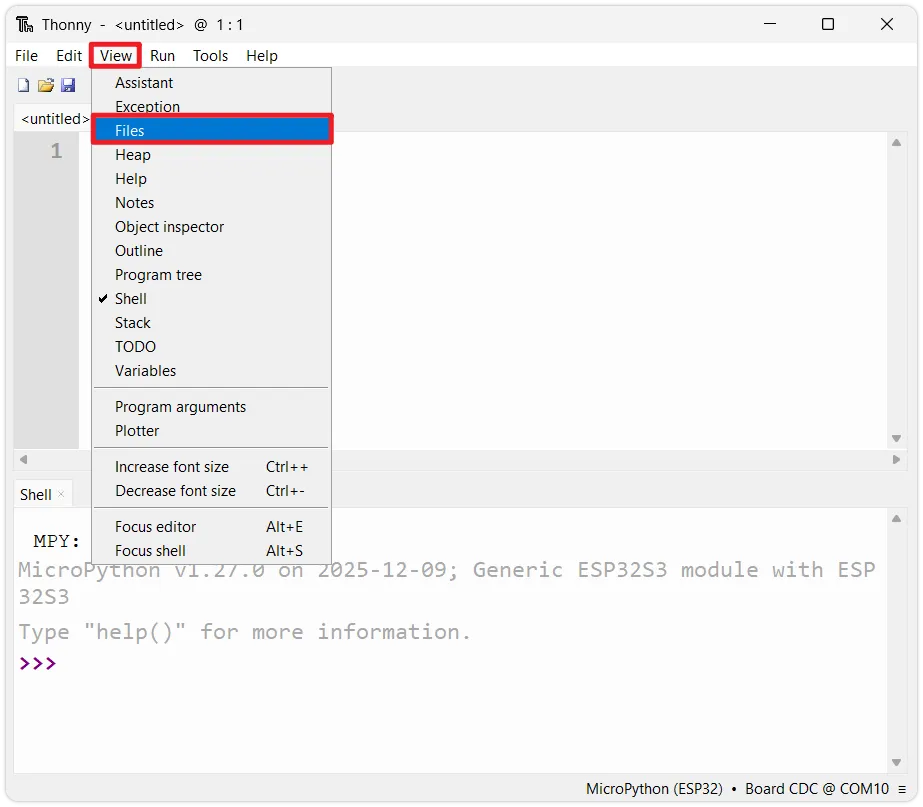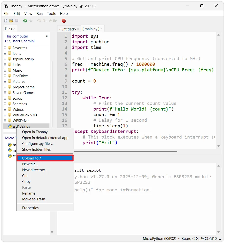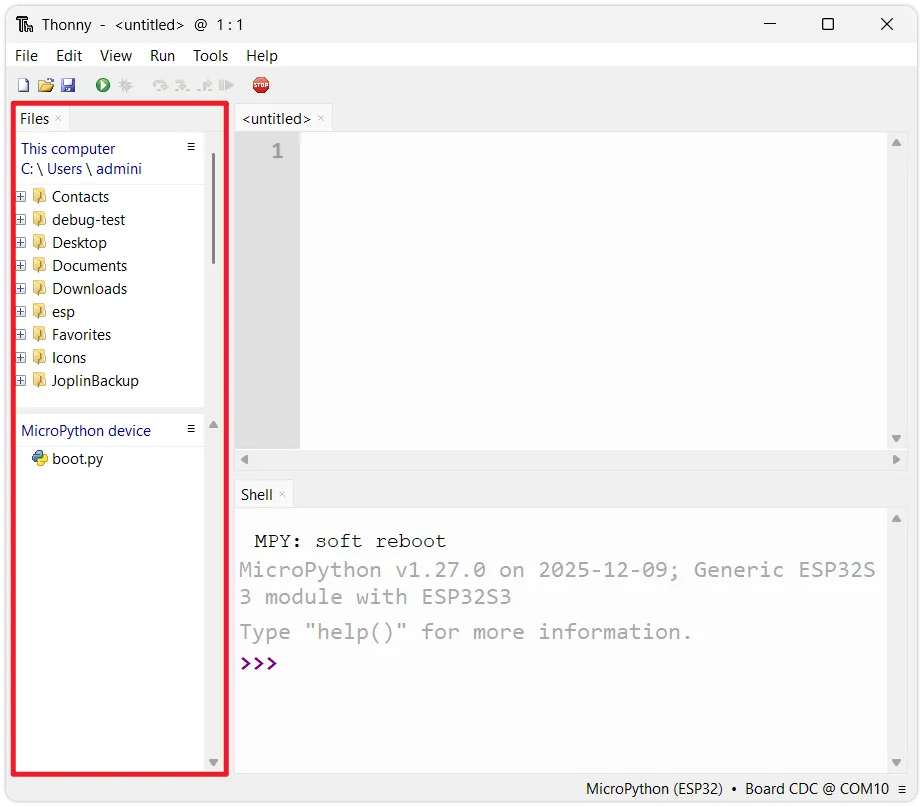 In embedded development, it's often necessary to transfer and manage files between the "local computer" and the "ESP32 device". Thonny provides a visual file view function to accomplish this.