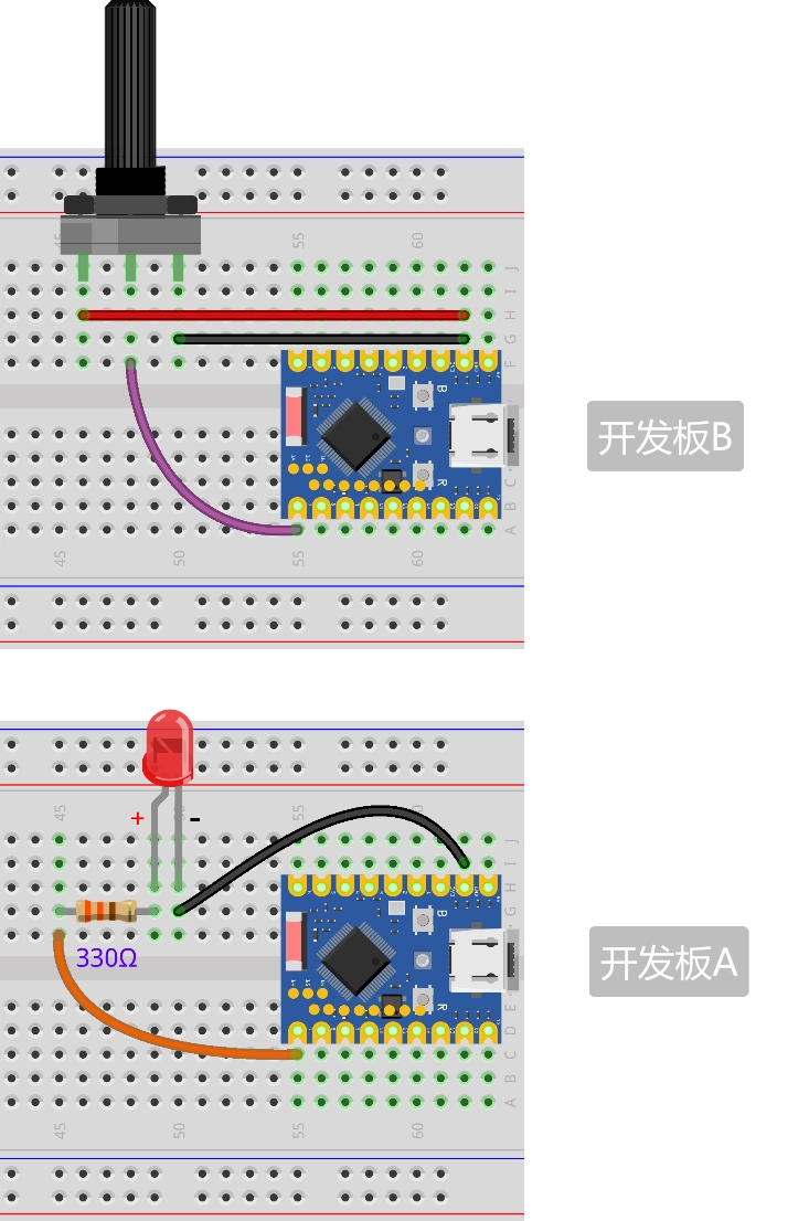 - Rotate the potentiometer on B, and the brightness of the LED on A will change smoothly.