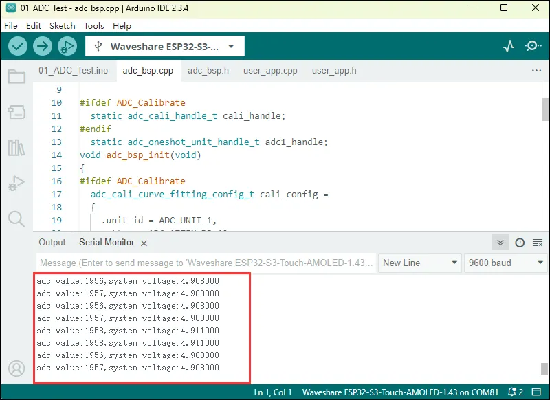 After the program is compiled and downloaded, you can view the printed ADC values and voltage output by opening the Serial Monitor, as shown in the following image: