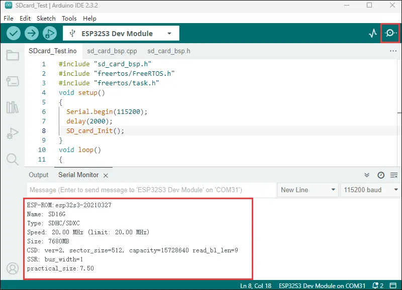 Click to open the Serial Monitor device. You can see the output TF card information; practical_size indicates the actual capacity of the TF card, as shown below: