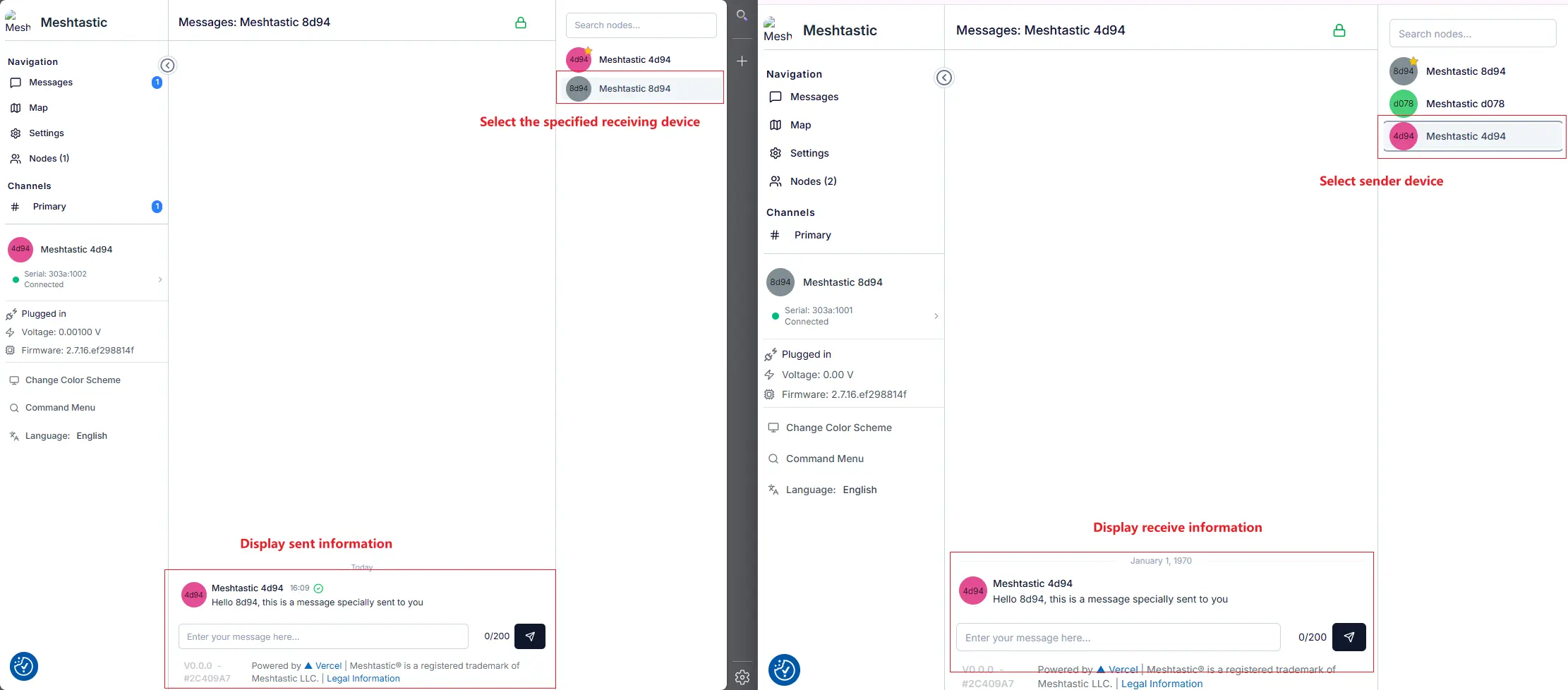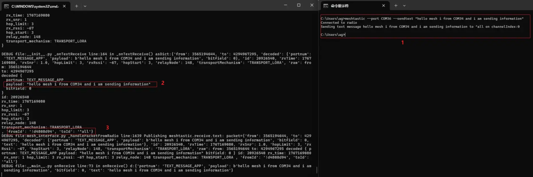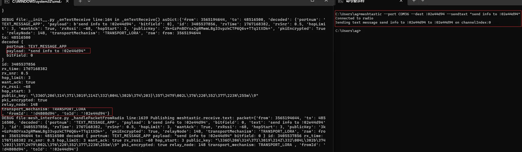 Send a message using meshtastic --port COM36 --dest !02e44d94 --sendtext "send info to !02e44d94”