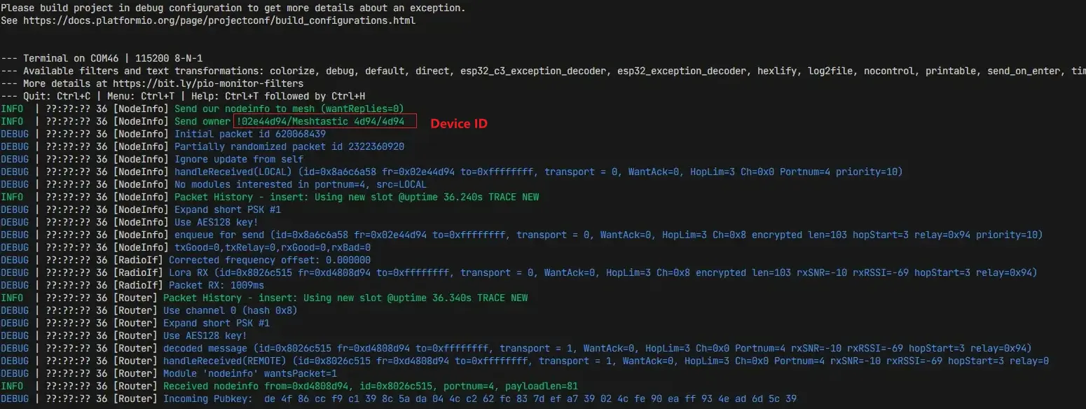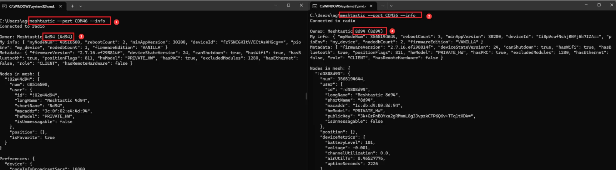Enter meshtastic --port your-com --info to view information for the device on the specified port.