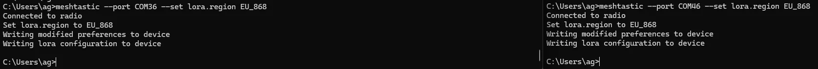 Use meshtastic --port your-com --set lora.region EU_868 to unify the operating frequency for both parties (please pay attention to the frequency range permitted by local regulations).
