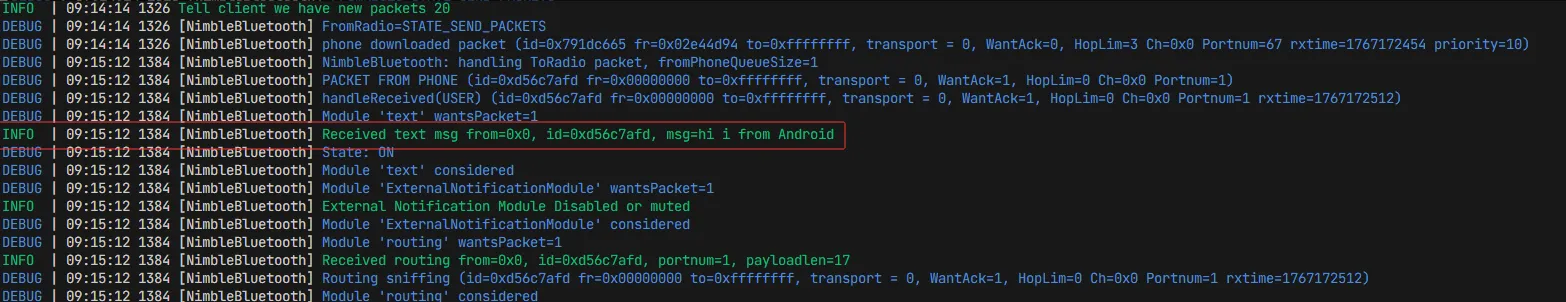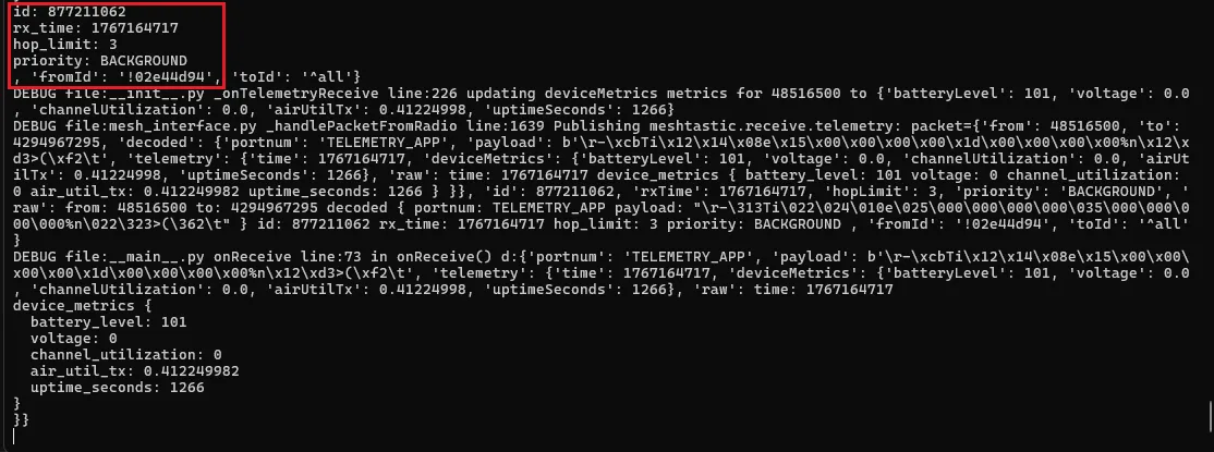 The (fromId) and (toId) fields in the listener's output indicate the sender ID and the intended recipient ID for this packet.