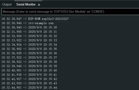 After the program is compiled and downloaded, open the serial port monitoring to see the RTC time of the printout, as shown in the following figure: