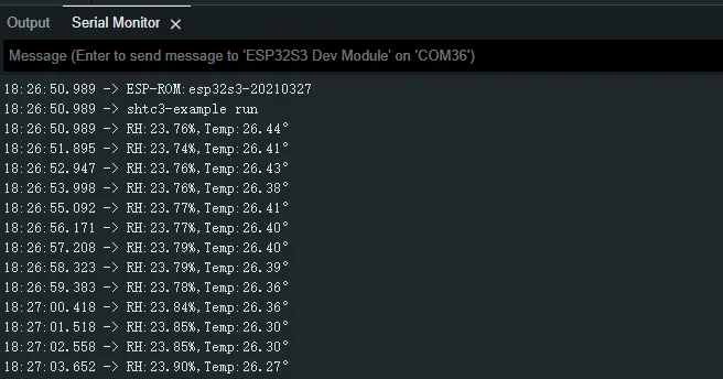 - Initialize the SHTC3 chip through the I2C protocol, and then print the temperature and humidity information read every 1 second to the terminal