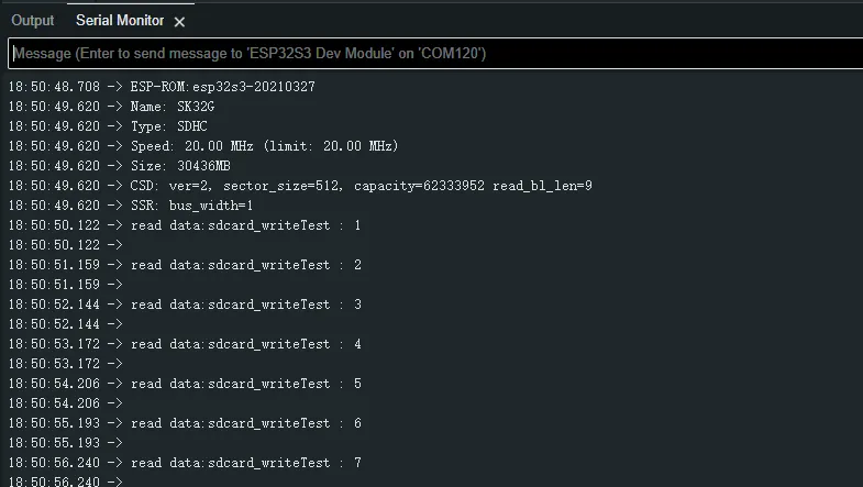 Click on the serial port monitoring device, you can see the output information of the TF card, as shown in the figure below: