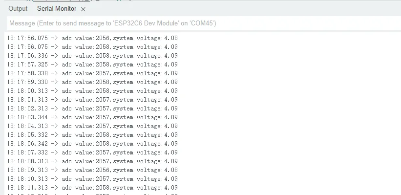 - The analog voltage connected through the GPIO is converted to digital by the ADC, and then the actual lithium battery voltage is calculated and printed to the terminal.