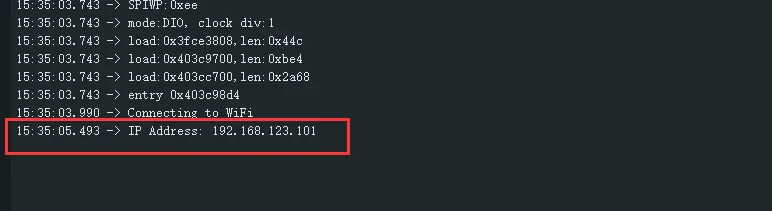 After flashing the program, open the serial terminal, if the device is successfully connected to the hotspot, the IP address obtained will be output, as shown in the figure: