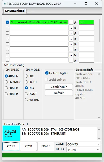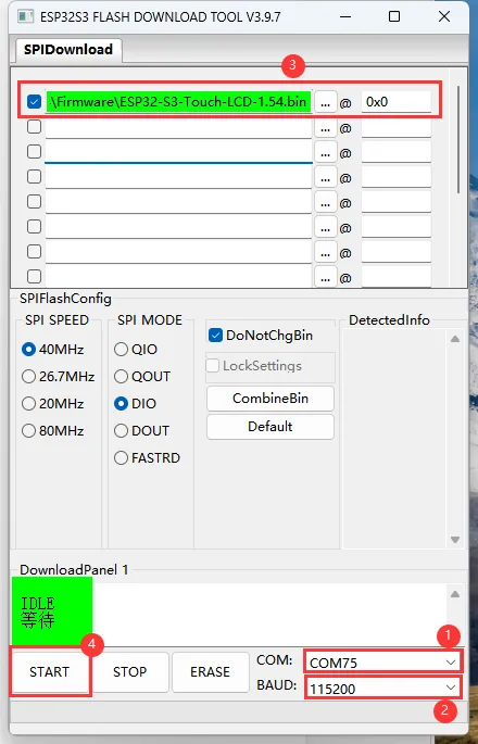 ESP32-S3-LCD-1.54-Demo\FirmwareorESP32-S3-Touch-LCD-1.54-Demo\Firmwaredirectory provided in the example package. Manually enter the download address "0x00", and check the box on the far left - ④. Start flashing