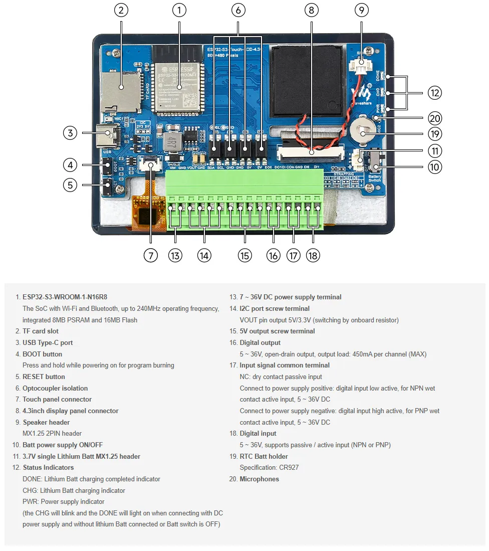 - Onboard 4.3inch 800×480 Capacitive Touch LCD Screen: Supports LVGL graphical interface display.