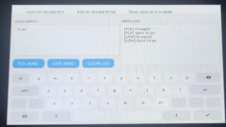 The serial port outputs connection information; basic data interaction is possible using a network debug assistant set to the corresponding IP address and port number; the screen displays network status and the current time.