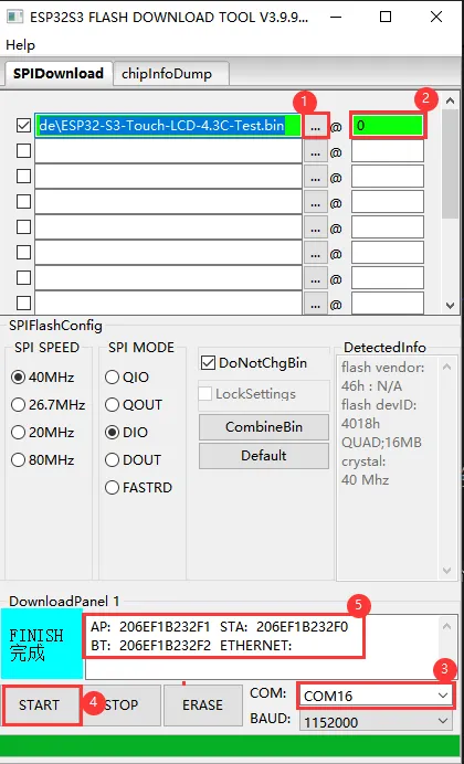 .\firmware\ESP32-S3-Touch-LCD-4.3C-Test.binto the Flash Tool. The flashing address is 0x00. -