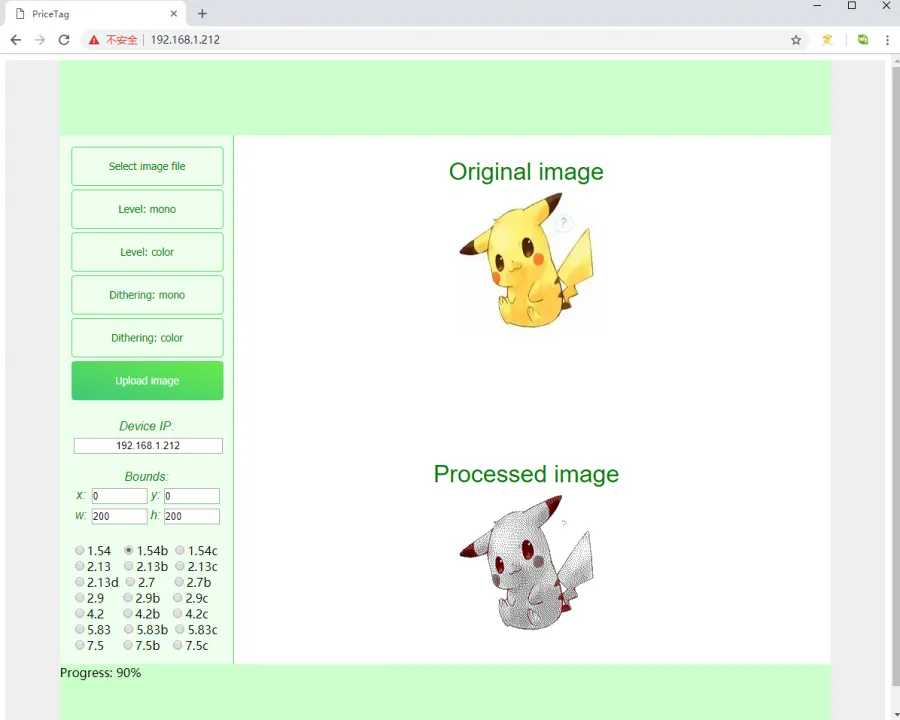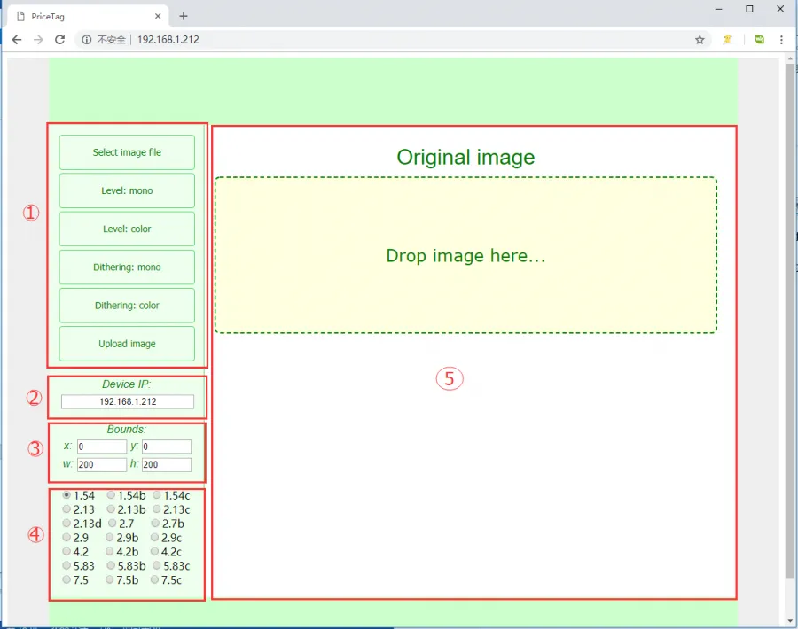 Select Image file: Click to select an image from the computer or phoneLevel: mono: Black‑and‑white color‑level image processing algorithmLevel: color: Multi‑color color‑level image processing algorithm (effective only for multi‑color screens)Dithering: mono: Black‑and‑white dithering image processing algorithmDithering: color: Multi‑color dithering image processing algorithm (effective only for multi‑color screens)Update image: Upload the image- IP Information Display Area: Shows the IP address of the currently connected module