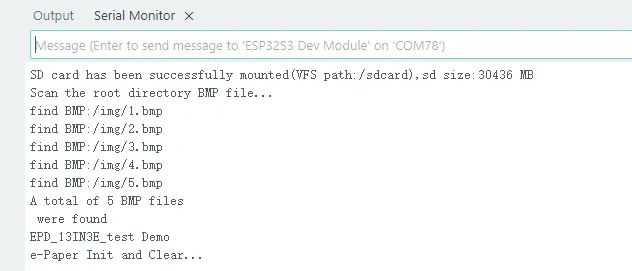 - This is a local Arduino example for the 13.3inch E6 e-Paper screen. It performs e‑Paper initialization, clears the screen, displays images, and draws basic graphics and text.