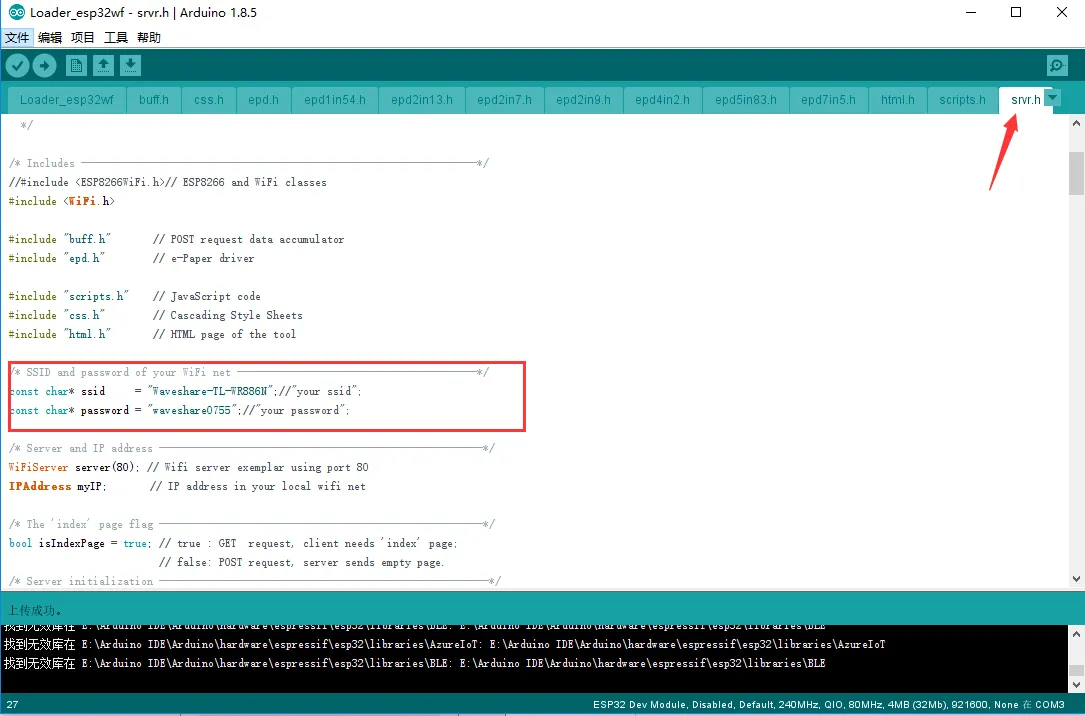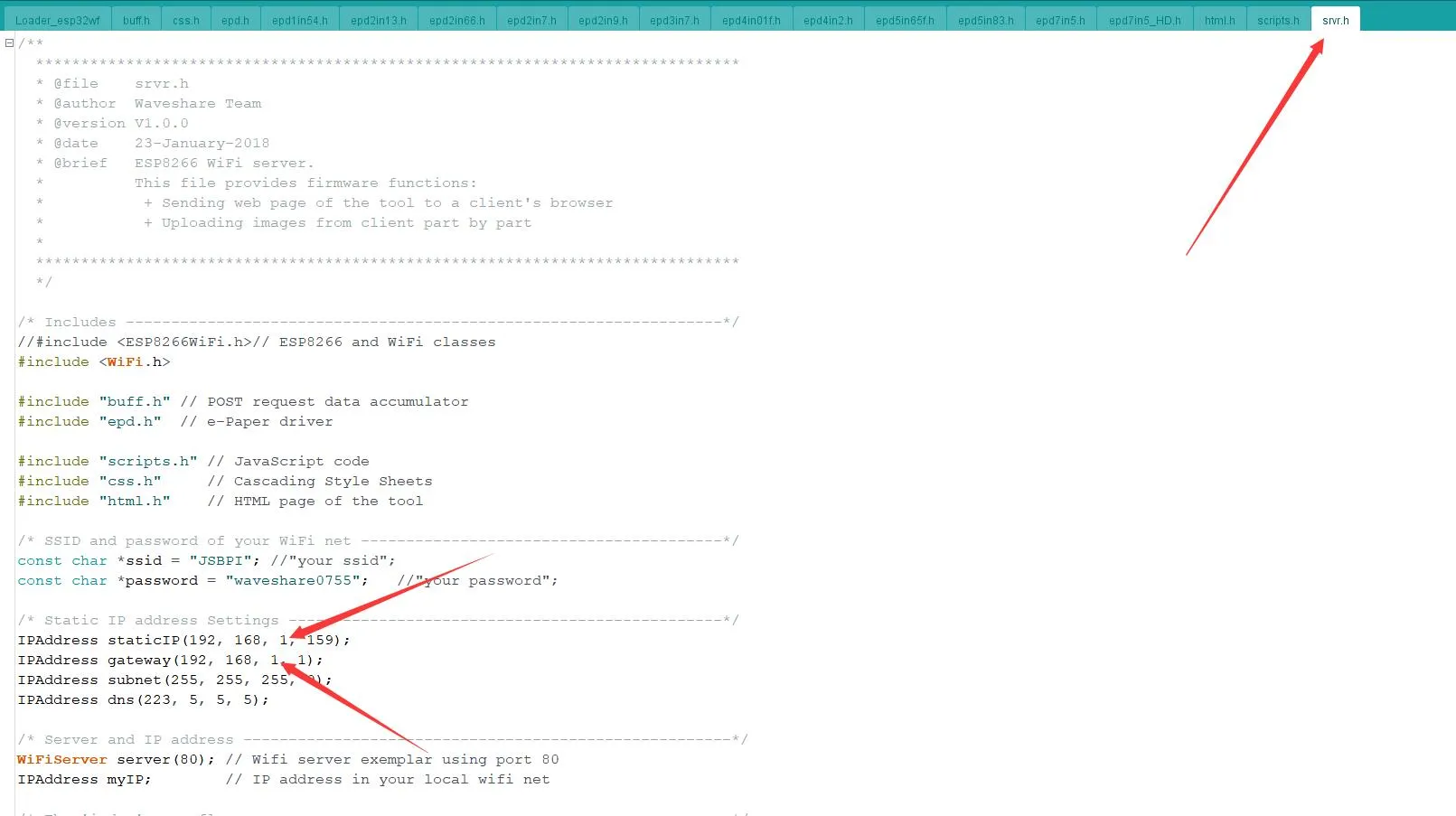srvr.h fileand modify the network segment shown in the image to match your network segment.warningThe ESP32's IP address (the last octet) must be different from the computer's IP address, but the other three octets must be exactly the same.