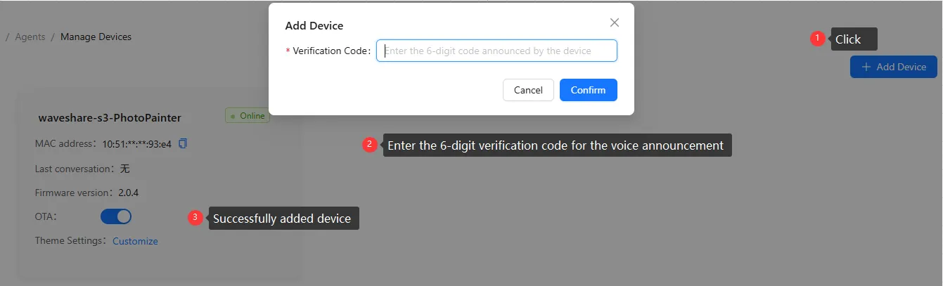 Xiaozhi-xxx(wherexxxis variable). - After successful network configuration, go to the Xiaozhi Console and add the corresponding device.