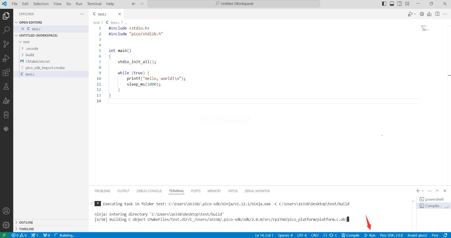Flashing using the Pico VS Code plugin Connect the development board to your computer and click "Run" to directly flash the firmware.