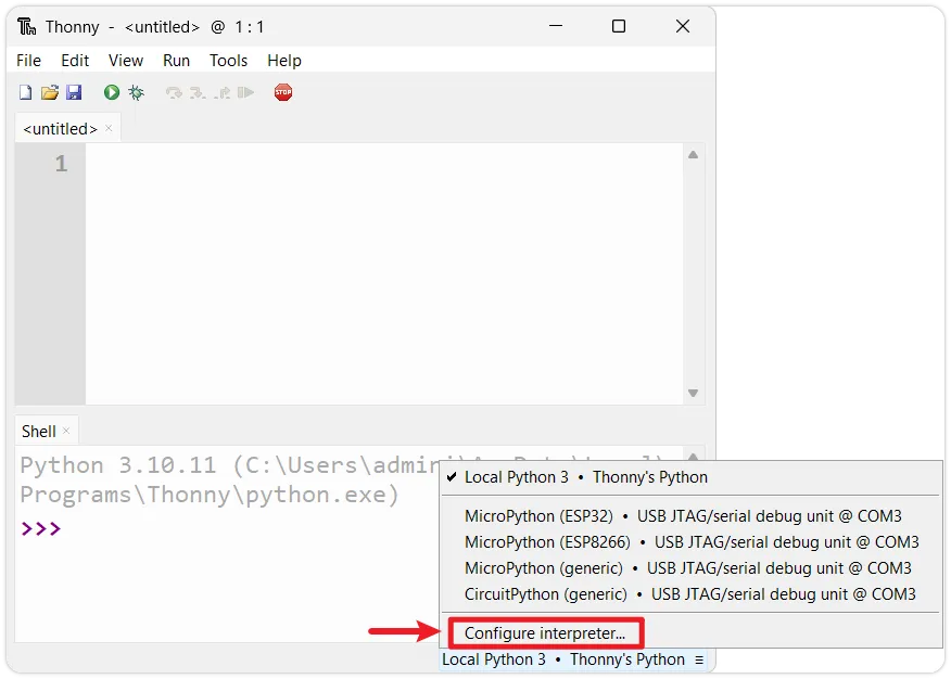 - First, connect the development board to your computer. Left-click the "Configure interpreter" option in the bottom-right corner of Thonny.