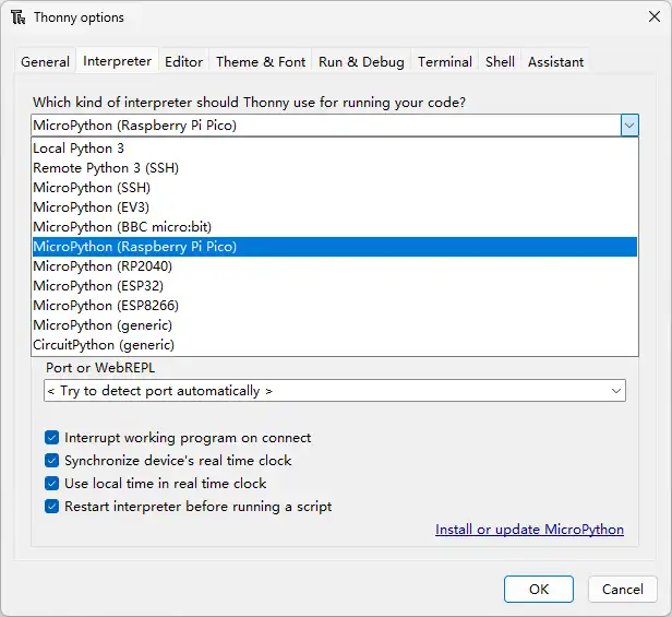 - In the pop-up window, select MicroPython (Raspberry Pi Pico), and choose the corresponding port